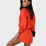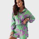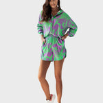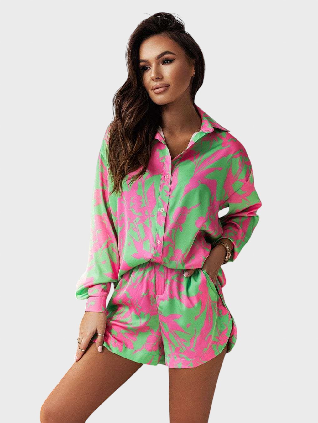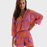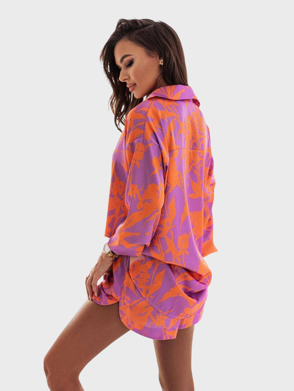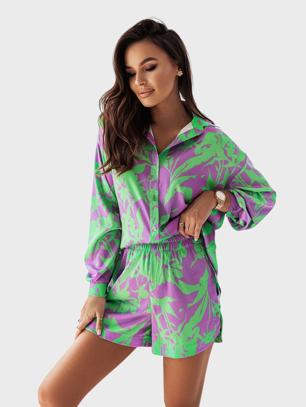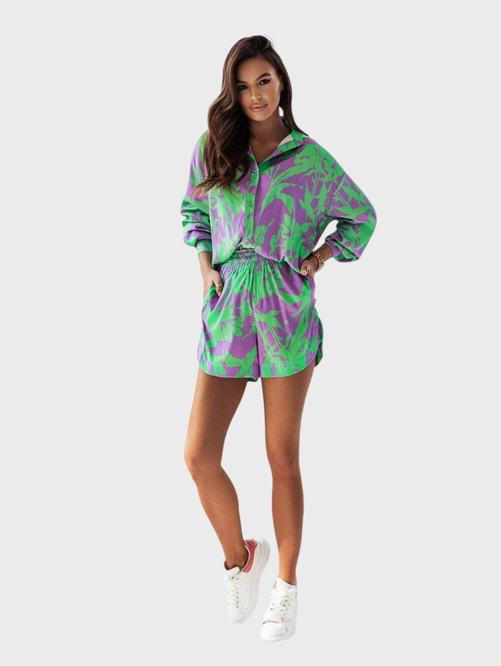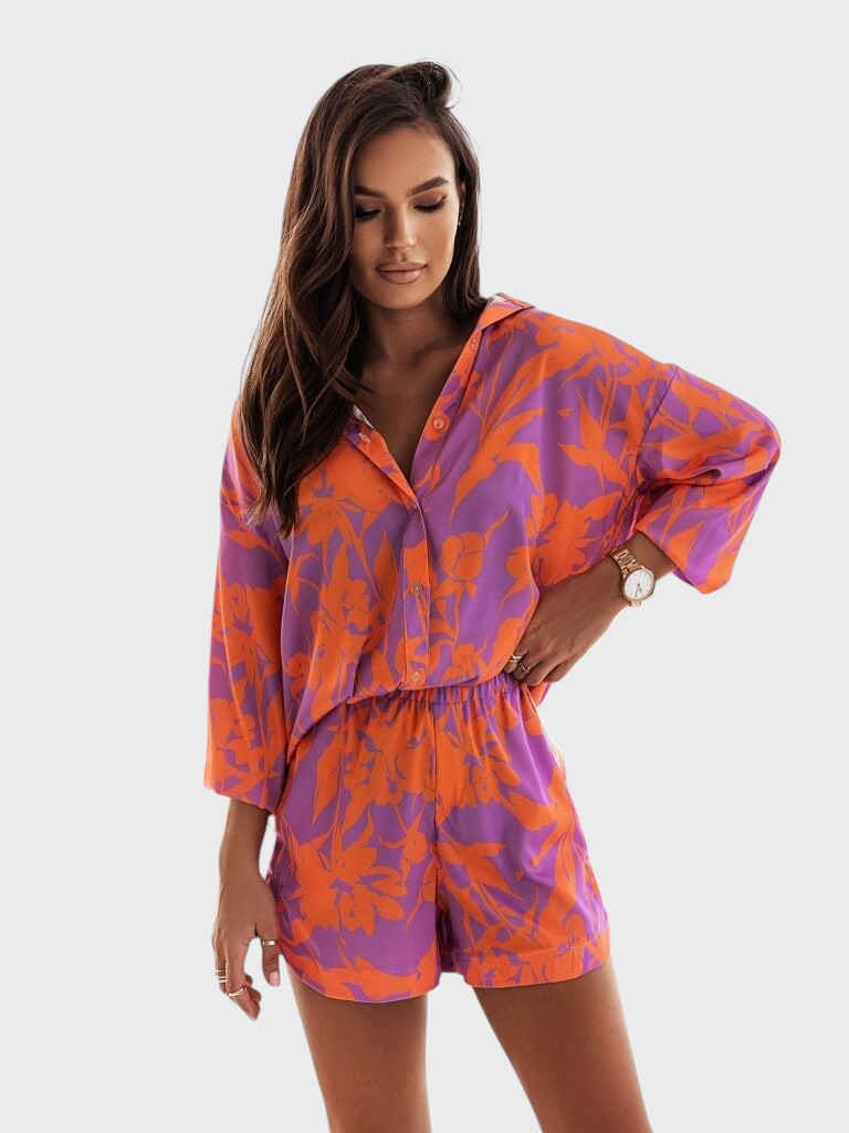 Потопете се в празнично настроение с този комплект от две части в ярки цветове и забавен принт. Той е перфектният избор за спокойна, но стилна лятна визия .
