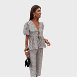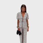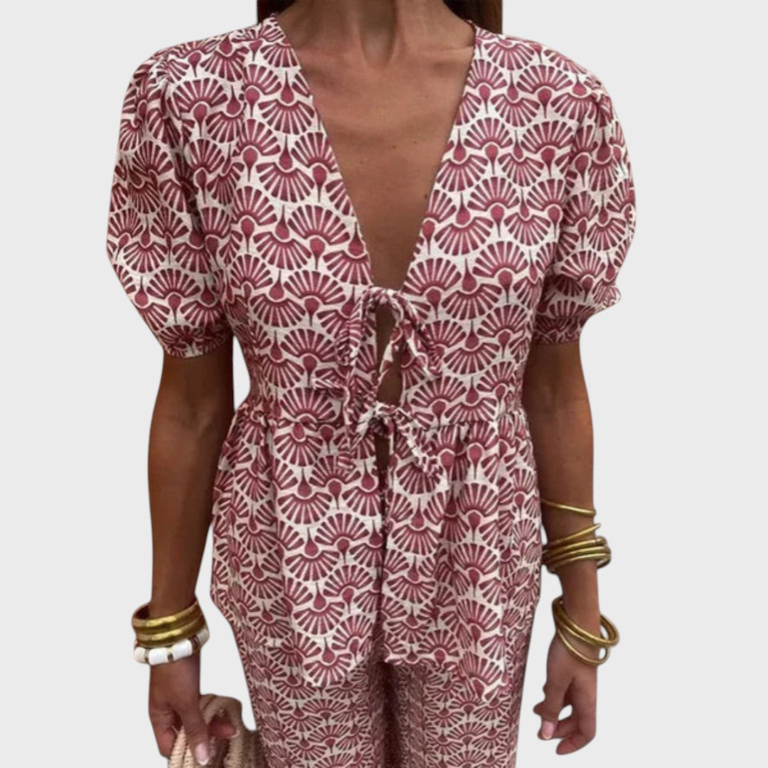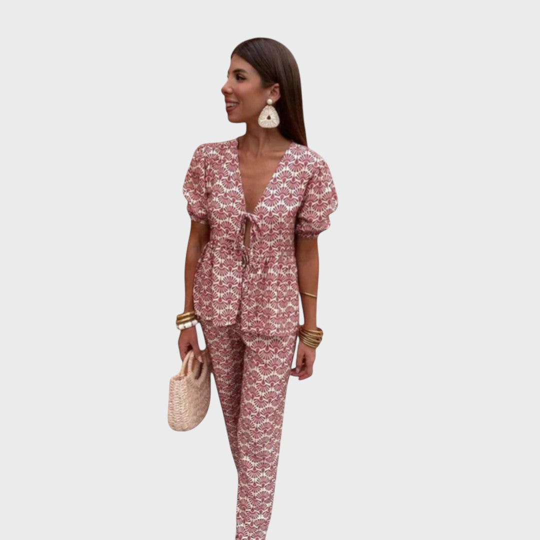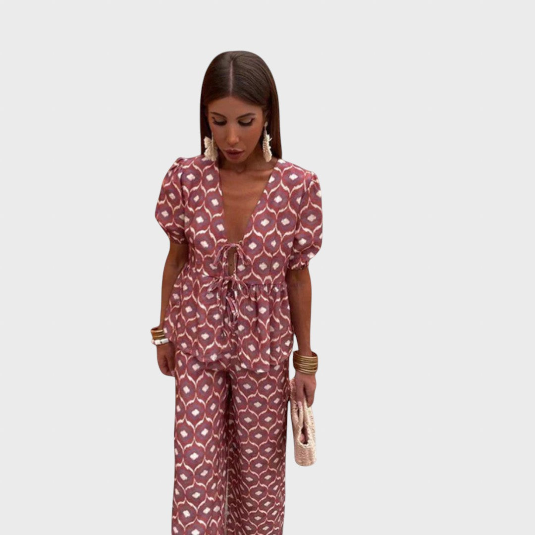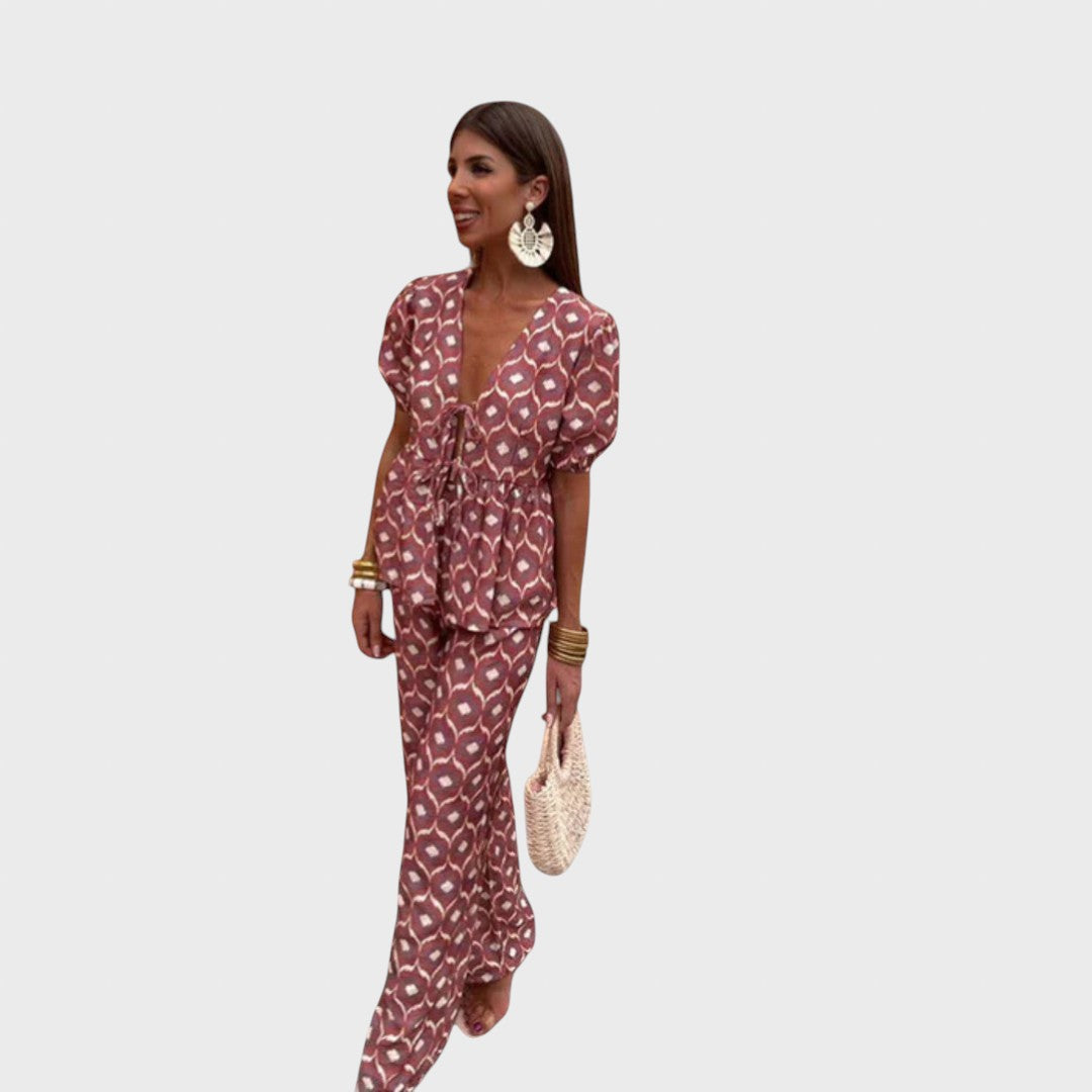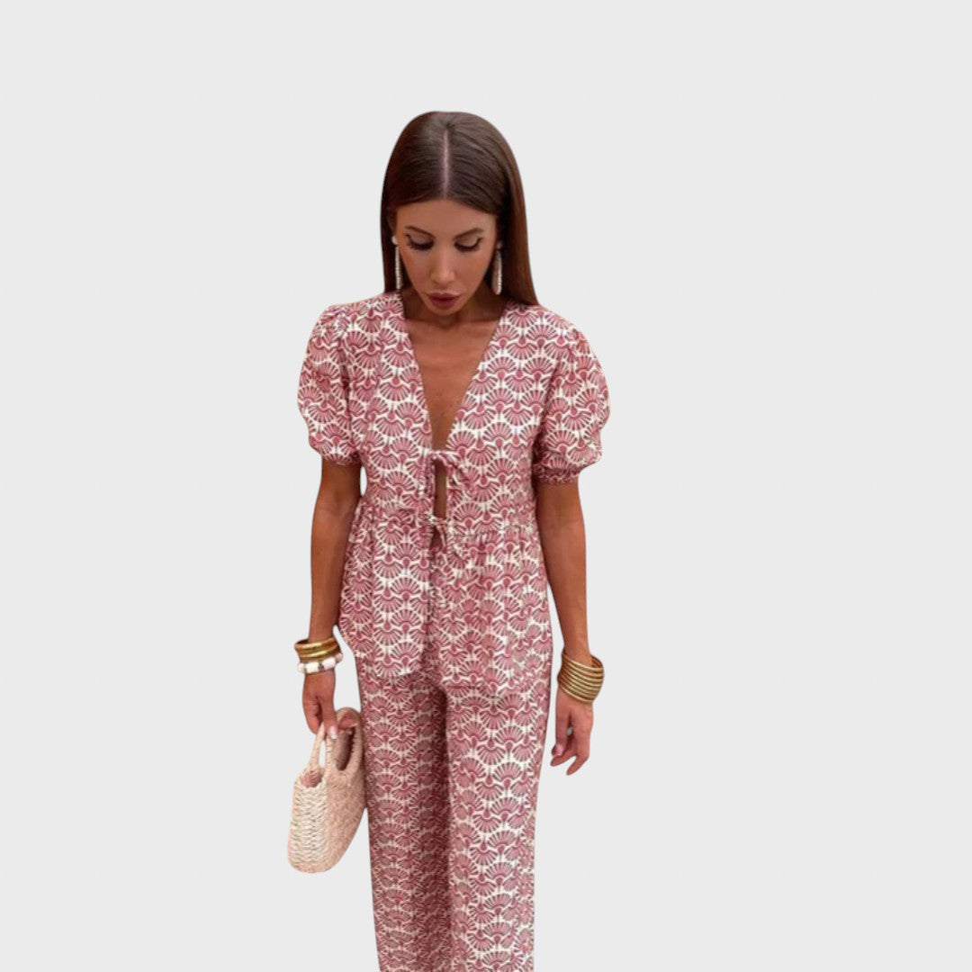 Този комплект е перфектната комбинация от женственост, комфорт и стил, идеален за летните дни. Състои се от ефирна блуза с къс ръкав и съответстващи леки панталони, създаващи хармонична, женствена и лесна за носене визия. Този тоалет е създаден, за да ви кара да блестите ден след ден.