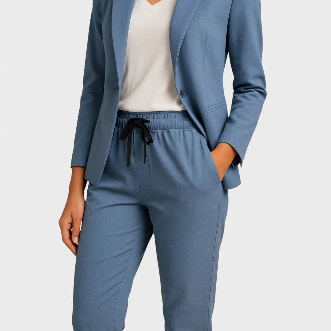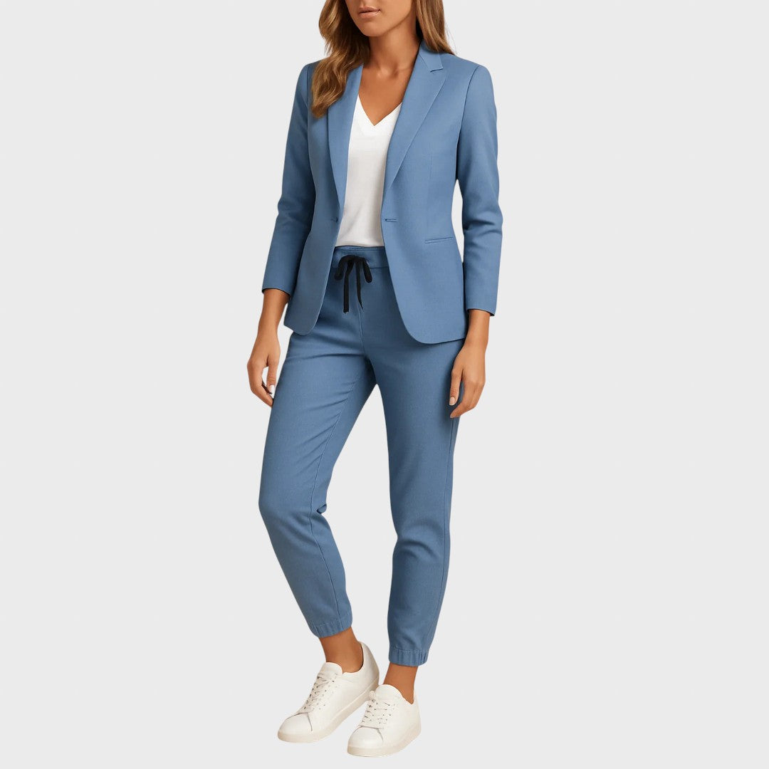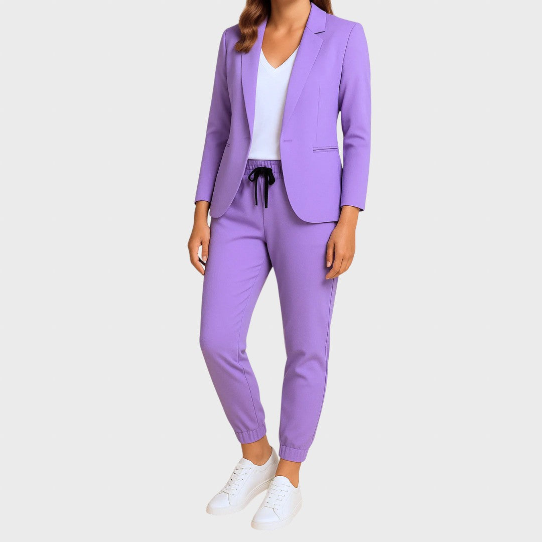 Усъвършенствайте стила си с тази перфектна комбинация от елегантност и комфорт. Този дамски костюм от две части е предназначен за тези, които искат да започнат деня си стилно и да го завършат с елегантност. Благодарение на висококачествените материали и разнообразните опции за стилизиране, ще бъдете готови за всеки повод, от офиса до уикенда.
