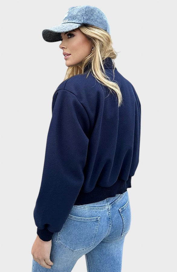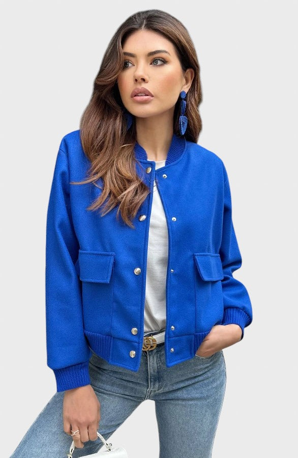 • Изискани дизайнерски детайли: Класическият силует на бомбър и сребристото закопчаване с тик-так копчета добавят модерен, изящен щрих.