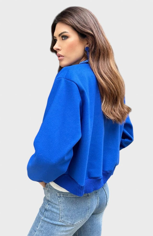 Това късо бомбър яке е елегантен и изискан вариант на ежедневен дизайн . Изработено от мека материя, то превръща това бомбър яке от спортен модел в изискан елемент за улична мода. Контрастните метални детайли му придават изключителна гъвкавост, позволявайки лесно преминаване между ежедневни и по-дръзки визии .